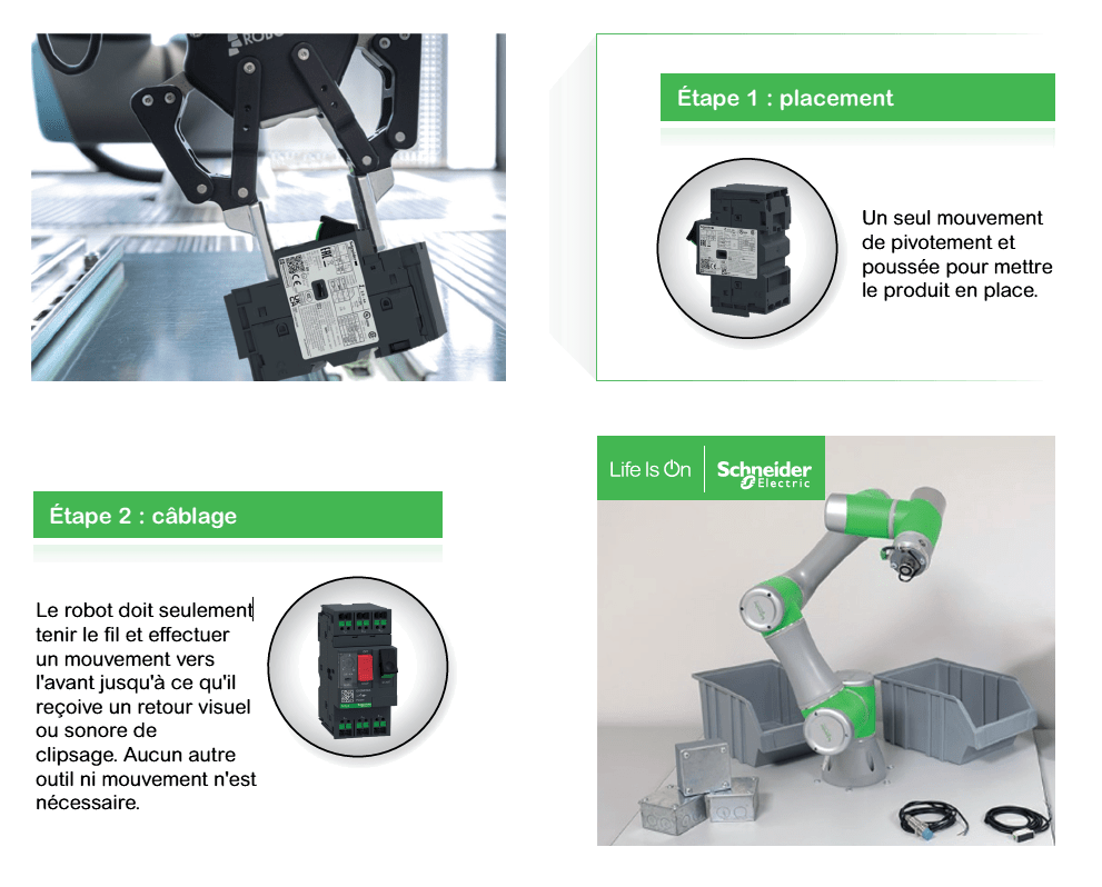 Les disjoncteurs et contacteurs Schneider Electric sont spécialement conçus pour être utilisés dans des process de production entièrement automatisés. Ils peuvent être assemblés automatiquement et câblés simplement, sans changer d’outils.